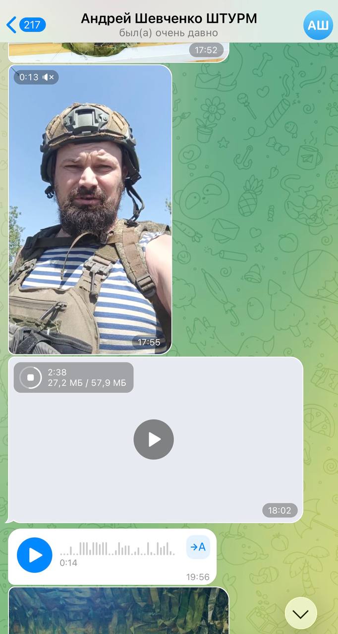 Вот Андрей Шевченко. Командир штурмов. Мы с ним так тепло выпили кофе. Удалось купить ему хорошую одежду, броник, много чего еще. И я был с ним постоянно на связи, ничего меня не «голодало», было полное ощущение выполненного долга пред ним. Всем помогли, всегда на связи. Я записал ему кружочек. Мы так общались. И вот ответ…