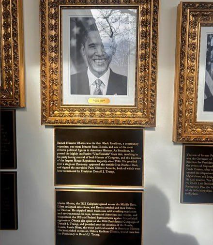 Табличка под портретом Джо Байдена — замененная в экспозиции автоматом для подписей — называет его "Сонным Джо" (Sleepy Joe) и называет его "худшим президентом в американской истории", обвиняя его в "серьёзном когнитивном снижении". Барака Обаму описывают как "одну из самых разделяющих фигур", с явной ссылкой на "российское вмешательство" — намек на расследование предполагаемого участия России в выборах 2016 года. Даже Хиллари Клинтон, не будучи президентом, несколько раз упоминается в контексте её поражения Трампу.